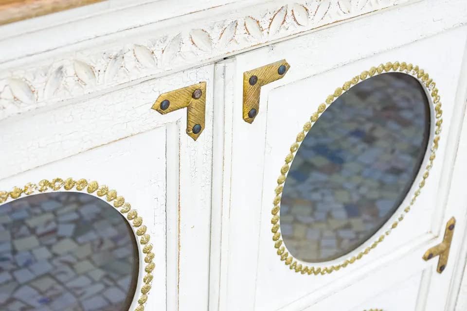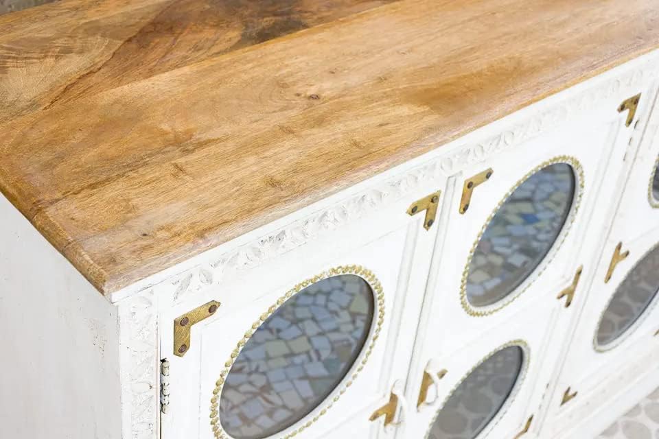 Antique Indian Brass Hand Carved Solid Wood Dining Sideboard Powder Coated Mango Wood Indian Arched Dining Sideboard Cabinets Storage Units Indian Solid Wood Veneer for Living Room Bedroom Furniture, Modern Dining Sideboards