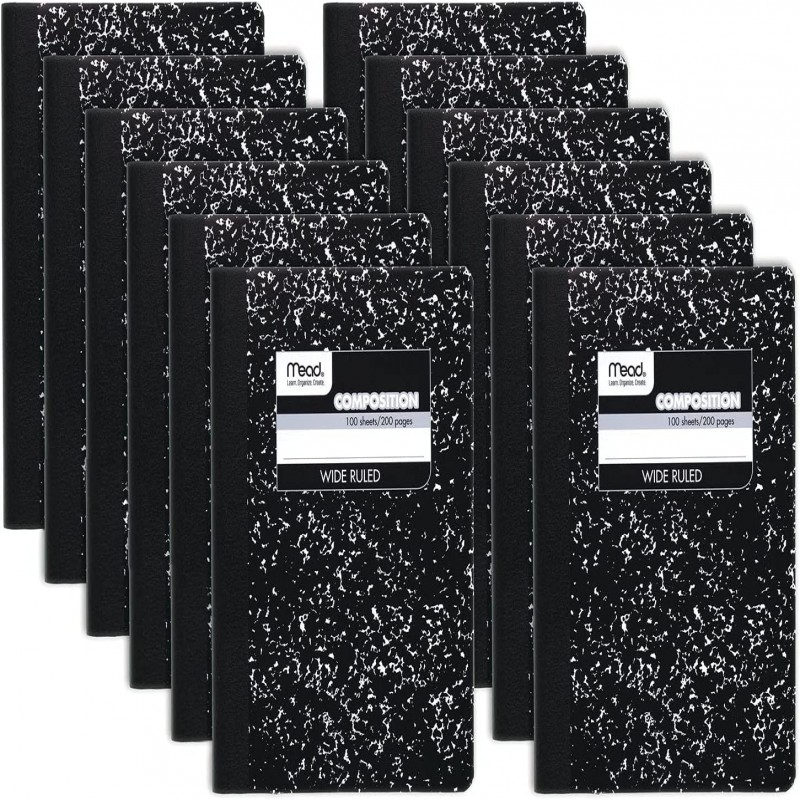 Mead Composition Notebooks, 12-Pack, Wide Grid Paper, 9-3/4 x 7-1/2, 100 Sheets Per Notebook, Black Marbled, 12-Pack
